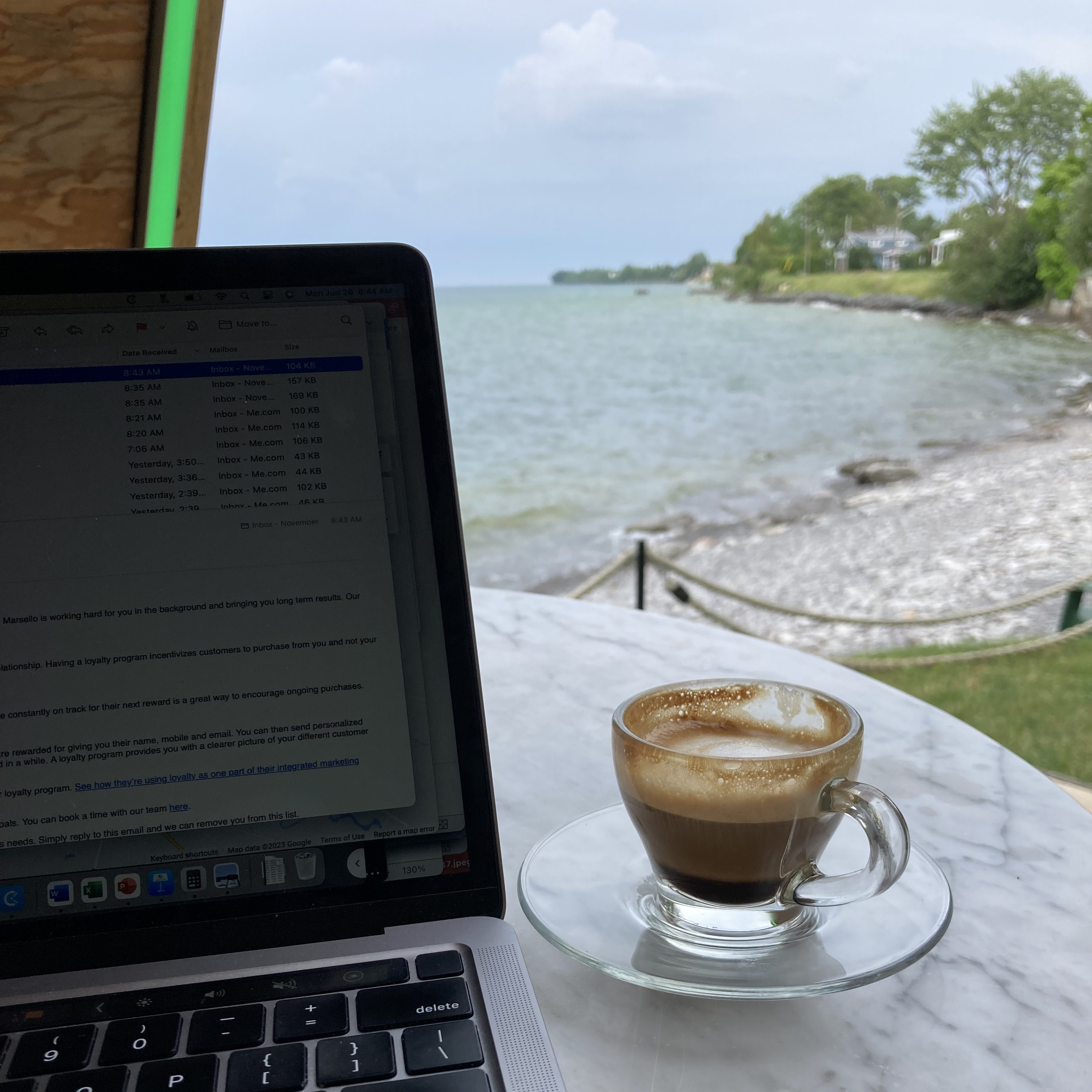 I came out to the back deck to look at the water. What I noticed was that despite the lake occupying about 3/4 of my field of vision, what I noticed more was how it sounded. Or rather how it didn’t sound – like beltway traffic, lawnmowers, construction, industrial hum, someone’s outdoor speaker, and all the other noise that I think all subconsciously conspire to keep me from going outside at home without a specific purpose. I sat for a while and listened. I missed my coffee. And then I thought of mindfulness and of the idea of being tuned into what I was feeling. And so instead of finding irritation at not having coffee, or trying to distract myself because I really really wanted some, I leaned into its absence. Like breathing into a sore area during a stretch. I tried to make something as small as a delay to my morning coffee into a conscious experience. And I realized that’s what these trips are for. Breaking out of routines is exactly the point, and every time I do it I have an opportunity to not just experience something a little differently, but to see if this new way is worth keeping.